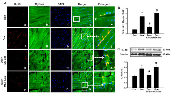 Inflammasome promotes autocatalytic activation of the cysteine protease caspase-1 and mediates the cleavage of inactive pro-IL-1β and IL-18, among other proteins, into their active forms. Unlike other caspases, caspase-1 is a key modulator of the inflammatory response to tissue injury [38,39,40]. The results show a higher expression of caspase-1 (Figure 5A), IL-1β (Figure 6A), and IL-18 (Figure 7A) after Dox administration (f–j) compared to control (a–e). Also, a significant decrease in the expression of these markers was observed after treatment with ES-Exos (k–o), while MEF-Exos (p–t) had no significant effect on decreasing their expression. The quantitative analysis of caspase-1+ (Figure 5B, p < 0.05), IL-1β+ (Figure 6B, p < 0.05) and IL-18+ (Figure 7B, p < 0.05) cells further confirmed these results as shown by significant increase in their expression in Dox-treated mice and a significant reduction after treatment with ES-Exos (p < 0.05).