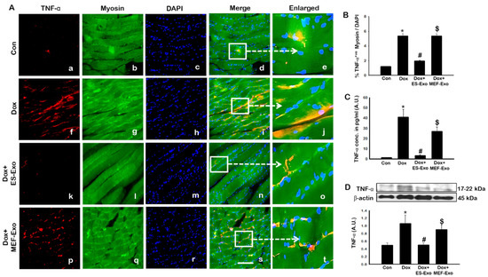 ES-Exos treatment attenuates Dox-induced release of pro-inflammatory cytokine, TNF-α. (A) Representative photomicrographs of soleus muscle sections stained with myosin and pro-inflammatory cytokine, TNF-α. Each box shows TNF-α+ cells in red (a,f,k,p), myocytes in green (b,g,l,q), DAPI in blue (c,h,m,r), merged images (d,i,n,s), and enlarged areas of merged images (e,j,o,t). (B) Histograms from quantitative analysis of TNF-α+ cells over total DAPI. (C) Quantification of ELISA analysis for TNF-α. (D) Representative blot and densitometric analysis of TNF-α. Error bars = mean ± S.E.M. * p < 0.05 vs. control, # p < 0.05 vs. Dox, $ p = non-significant vs. Dox, one-way ANOVA followed by Tukey test; western blot and ELISA quantities are represented as A.U. Scale bar = 100 µm, n = 14–16, male and female (B) and n = 6–8, male and female (C,D). Images taken at 40× magnification.