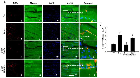 Treatment with ES-Exos reduces pro-inflammatory M1 macrophage abundance following Dox administration. (A) Representative photomicrographs of soleus muscle sections stained with myosin and M1 macrophage marker, iNOS. Each box shows iNOS+ cells in red (a,f,k,p), myocytes in green (b,g,l,q), DAPI in blue (c,h,m,r), merged images (d,i,n,s), and enlarged areas of merged images (e,j,o,t). (B) Histograms from quantitative analysis of iNOS+ cells over total DAPI. Error bars = mean ± S.E.M. * p < 0.05 vs. control, # p < 0.05 vs. Dox, $ p = non-significant vs. Dox, one-way ANOVA followed by Tukey test; Scale bar = 100 µm, n = 14–16, male and female. Images taken at 40× magnification.