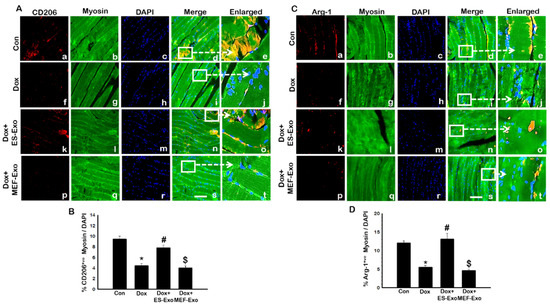 ES-Exos enhances levels of anti-inflammatory M2 macrophage markers, CD206 and Arg-1 in Dox mice. (A) Representative photomicrographs of soleus muscle sections stained with myosin and M2 macrophage marker, CD206. Each box shows CD206+ cells in red (a,f,k,p), myocytes in green (b,g,l,q), DAPI in blue (c,h,m,r), merged images (d,i,n,s), and enlarged areas of merged images (e,j,o,t). (B) Histograms from quantitative analysis of CD206+ cells over total DAPI. (C) Representative photomicrographs of soleus muscle sections stained with myosin and M2 macrophage marker, Arg-1. Each box shows Arg-1+ cells in red (a,f,k,p), myocytes in green (b,g,l,q), DAPI in blue (c,h,m,r), merged images (d,i,n,s), and enlarged areas of merged images (e,j,o,t). (D) Histograms from quantitative analysis of Arg-1+ cells over total DAPI. Error bars = mean ± S.E.M. * p < 0.05 vs. control, # p < 0.05 vs. Dox, $ p = non-significant vs. Dox, one-way ANOVA followed by Tukey test; Scale bar = 100 µm, n = 14–16, male and female. Images taken at 40× magnification.