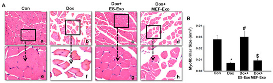 To evaluate the histological effects of ES-Exos treatment, myofibrillar size on transverse sections of soleus muscle was determined using H&E staining. Representative pictures of the H&E stain (Figure 12A) shows the architecture of the soleus muscle with visible decreased muscle size after Dox administration (b and f) compared to control (a and e). Treatment with ES-Exos enhanced the size of the soleus muscle cell (c and g), while the size remained the same for mice treated with MEF-Exos (d and h) compared to Dox. Our quantitative data showed a significant decrease in myofibrillar size in mice treated with Dox compared to control (Figure 12B, p < 0.05), hence exhibiting muscular atrophy. Importantly, ES-Exos treatment group had significantly increased myofibrillar size, displaying protective effects against skeletal muscle atrophy (p < 0.05). MEF-Exos failed to display any protective properties in muscle atrophy.