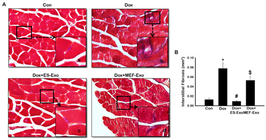 To evaluate interstitial fibrosis (IF) during skeletal muscle remodeling induced by Dox, and demonstrate the therapeutic effects of ES-Exos against collagen deposition, Masson’s trichrome staining was performed. Representative images show increased IF (Figure 13A) in transverse sections of soleus muscle tissue for Dox mice (Figure 13A(b)) compared to control (Figure 13A(a)). Interestingly, treatment with ES-Exos (Figure 13A(c)) visibly reduced IF while MEF-Exos (Figure 13A(d)) treatment was unable to reduce IF following Dox treatment. Furthermore, quantitative data showed significantly higher fibrosis in Dox-administered mice as compared with control (Figure 13B, p < 0.05). Importantly, mice that received ES-Exos as a treatment showed significantly diminished fibrosis within the muscle cells (p < 0.05), suggestive of the structural protection provided by treatment with ES-Exos against DIMT. Further, MEF-Exos had no significant effect in reducing fibrosis after Dox treatment.