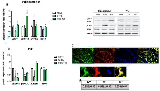 2.6. HSE Increased p-ERK44/42 and Brain-Derived Neurotrophic Factor (BDNF) Expression in the Hippocampus