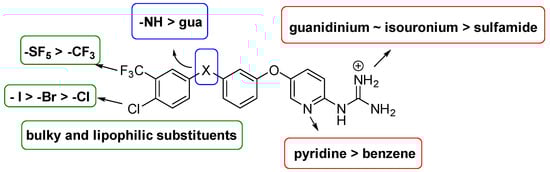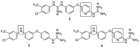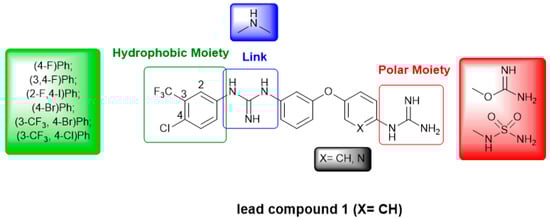 Considering the structure of compound 1 (“link” -blue box-, “polar moiety” -red box- and “hydrophobic moiety” -green box-; see Figure 1), we explored a number of modifications in the different moieties, while maintaining the diaryl ether core due to its versatility and suitability for synthesis. First, several “hydrophobic” substituents have been considered (green box in Figure 1), since in our previously reported computational model [12], this section of the molecule seems to interact with a hydrophobic pocket. Next, based on previous computational studies [9], the effect of the length of the molecule on its activity has been studied by replacing the disubstituted guanidinium in the “link” by a secondary amine (blue box in Figure 1). Additionally, we explored the effect of substituting one of the phenyl rings by a pyridine to lock the orientation of the guanidinium by means of intramolecular hydrogen bonds (IMHBs) [13]. Finally, in the “polar” region, different guanidine surrogates (i.e., isourea and sulfamide) have been tested (red box in Figure 1).