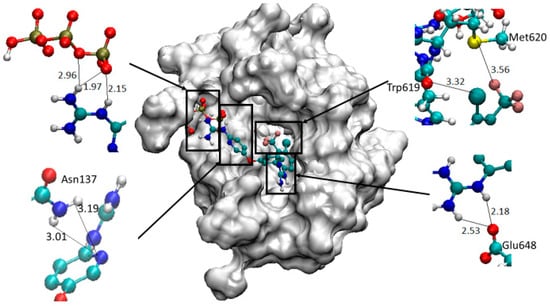 Finally, the docking study of compound 4 (Figure 2) into the aforementioned target reproduce the results observed for the mono-substituted guanidinium pyridine system in analogue 2 by establishing bifurcated HBs with the TP, IMHB between guanidinium and pyridine as well as contacts between the pyridine N and Asn137. Additionally, as the -NH- shortens the structure, similar interactions to those seen for compound 3 are observed, i.e., the -NH- group forms a HB with Glu648 and contacts within the hydrophobic pocket are found (Figure S3).