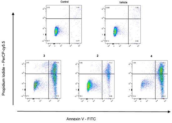 We have previously reported that compound 1 induces 68.9 ± 0.1% apoptosis in HL-60 cells at a 10 μM concentration after 48 h [8]. Accordingly, in order to evaluate the apoptotic effect of the most relevant derivatives (2, 3, and 4), HL-60 cells were treated with these compounds (at 5 µM, 5 µM, and 4 µM concentration, respectively) for 48 h, stained with annexin V-FITC/PI and analysed using flow cytometry (Figure 5).