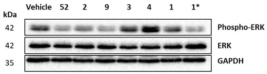 Western immunoblot of HL-60 cell extracts following incubation with compounds 2, 3, 4, 9, 52 and 1 (as a control). HL60 cells were seeded at 2 × 105 cells/mL and were treated with either vehicle [0.5% EtOH (v/v)], compounds 52, 2, 9, 3 and 4 (5 µM) or compound 1 (5 and (*) 10 µM, as in reference [9]) for 16 h. Cells were lysed and equal amounts of protein were loaded and separated on 15% SDS-PAGE gels, transferred to PVDF membrane and probed with antibodies against total and phosphorylated ERK. Anti-GAPDH was used as a loading control. Results are representative of 2 independent experiments.
