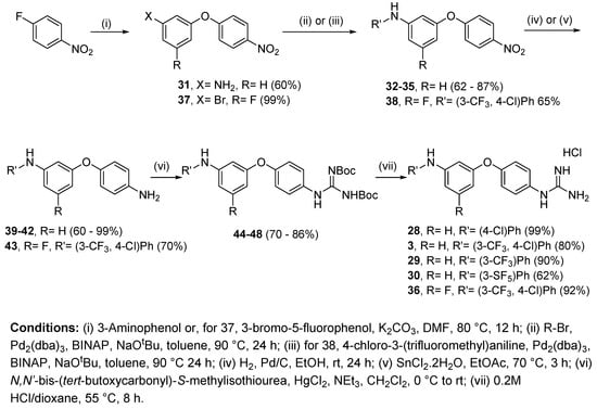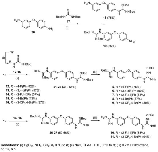 Based on this computational study, 3,4′-bis-guanidino diphenyl ether derivatives 5–11 were prepared by reacting the corresponding 3,4′-diamino diphenyl ether with conveniently substituted Boc-protected thioureas. Additionally, synthesis of the 3-amino-4′-guanidino diphenyl ethers 3, 28–30 and 36 required the preparation of the corresponding starting diamines. Furthermore, preparation of 3,4′-bis-guanidino and 3-amino-4′-guanidino phenylpyridyl ether derivatives 2, 49–52, and 4, required different synthetic approaches involving Buchwald–Hartwig coupling. Finally, the 3-amino-4′-isouronium 70 and 3-amino-4′-sulfonamido 75 derivatives were prepared following specific synthetic routes. All compounds were obtained as hydrochloride salts and their purity was determined to be >95% by HPLC before proceeding to biological testing.