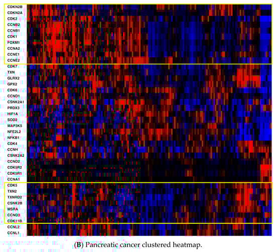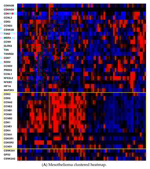Second, key non-cell cycle CDKs (CDK5 and CDK11B) clustered with key antioxidant genes, including thioredoxin 2 (TXN2), methionine sulfoxide reductase (MSRA), and thioredoxin reductase 2 (TXNRD2). mRNA expression was also compared utilizing Spearman and Pearson coefficients (two distinct, and complementary, correlation formulas available in cBioPortal) among key pathway genes for all three cancers to determine the strength of association (Table S1, Supplementary Materials). For mesothelioma, key interactions (either positive or negative, with Spearman and/or Pearson coefficients with absolute values > 0.3) included CDK2-TXN2 (neg), CDK2-FOXM1 (pos), CDK2-CSNK2A1 (gene for CK2) (pos), CDK4-NFKB1 (neg), CDK4-FOXM1 (pos), CDK5-TXN2 (pos), CDK5-GLRX2 (pos), CDK5-NFKB1 (neg), CDK5-CSNK2B (pos), TXN-GLRX2 (pos), TXN-CSNK2B (pos), TXN2-GLRX2 (pos), TXN2-CSNK2B (pos), and HIF1-TXN2 (neg). (GLRX2 encodes glutaredoxin 2, CSNK2A1 encodes the protein CK2A, CSNK2B encodes the protein CK2B, and HIF1 encodes hypoxia inducible factor 1.) For pancreatic cancer, notable associations included CDK2-TXN2 (neg), CDK2-FOXM1 (pos), CDK2-HIF1 (pos), CDK4-CSNK2B (pos), CDK5-TXN2 (pos), CDK5-TXNRD2 (pos), CDK5-GLRX2 (pos), CDK5-NFKB1 (neg), CDK5-CSNK2B (pos), TXN-GLRX2 (pos), TXN-CSNK2B (pos), TXN-GPX2 (pos), TXN-FOXM1 (pos), TXN2-TXNRD2 (pos), TXN2-CSNK2B (pos), HIF-TXN (neg), HIF-TXNRD1 (pos), HIF-TXN2 (neg), HIF-TXNRD2 (neg), HIF-SOD2 (pos), and HIF-NFKB1 (pos). (GPX2 encodes glutaperoxidase 2, TXN encodes thioredoxin 1, and SOD encodes superoxide dismutase.) For hepatocellular carcinoma, associations included CDK2-TXN2 (neg), CDK2-TXNRD2 (neg), CDK2-FOXM1 (pos), CDK2-CSNK2A1 (gene for CK2) (pos), CDK2-HIF1 (pos), CDK4-PRDX3 (neg), CDK4-CSNK2A1 (pos), CDK4-CSNK2B (pos), CDK5-GLRX2 (pos), CDK5-NFKB1 (neg), CDK5-CSNK2B (pos), CDK5-HIF1 (neg), TXN-TXNRD1 (pos), TXN-GLRX2 (pos), TXN-GPX2 (pos), TXN-SOD2 (pos), TXN2-NFKB1 (neg), TXN-CSNK2B (pos), TXN2-TXNRD2 (pos), TXN2-NFKB1 (neg), TXN2-CSNK2A1 (neg), TXN2-CSNK2B (pos), HIF1-TXN (neg), HIF1-TXN2 (neg), HIF1-TXNRD2 (neg), HIF1-NFKB1 (pos), HIF1-CSNK2A1 (pos), and HIF1-CSNK2B (neg). Please see the Supplemental Data Table for a tabular format of the above information.