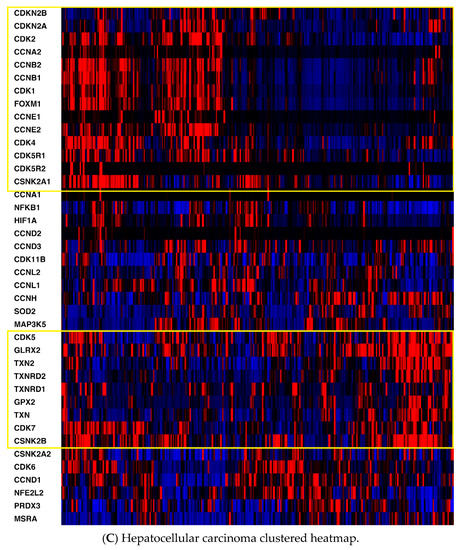 (A) Mesothelioma heatmap with cell cycle-related genes boxed; (B) Pancreatic cancer heatmap (cell cycle-related genes in the top box, antioxidant defense-related genes in the bottom box; (C) Hepatocellular carcinoma heatmap (cell cycle-related genes in the top box, antioxidant defense-related genes in the bottom box). Red, higher expression; blue, lower expression. Box is in yellow.