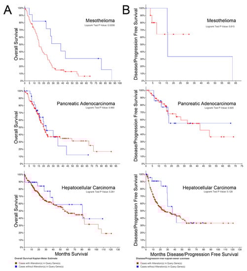 The Cancer Genome Atlas has been a significant and widely utilized resource [39]. Many cancers, including mesothelioma, hepatocellular carcinoma, and pancreatic cancer, have been included in the TCGA efforts [40,41,42]. A web-based tool, cBioPortal, has been created and is continually updated to aid in the analysis of TCGA data [43,44]. Currently, experimental treatments do not take full advantage of the knowledge about the transcriptomics of these diseases. We interrogated the TCGA data using cBioPortal and employing a set of genes (Table 1) encompassing these two pathways to determine their potential utility in meeting the urgent need for new precision oncology-based treatment approaches for these diseases.