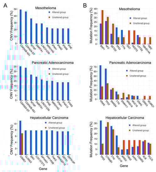 (A) Copy number variation (CNV) frequency; (B) Mutation frequency.