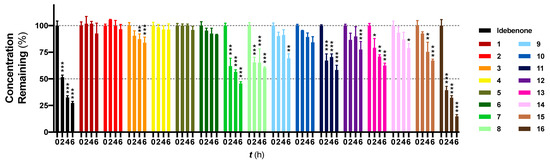 Metabolic stability study of 16 new SCQs and the reference benzoquinone idebenone. HepG2 cells were exposed to each SCQ at 40 μM for up to 6 h. Concentrations found at t = 0 were normalized to 100% and concentrations found at other time points were normalized by accordingly dividing by the concentrations found at t = 0, × 100%. Data was expressed as mean ± standard error of mean (SEM) from at least one experiment, with at least three data points each. Two-way ANOVA was performed to compare concentrations found at t = 2 h, 4 h, 6 h to t = 0 for each compound: *** p < 0.001, ** p < 0.002, * p < 0.033.