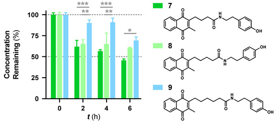 Comparison of metabolic stability and carbon chain length between the quinone core and the amide linkage for the structurally similar tyramine derivatives 7–9. Data was expressed as mean ± SEM from at least one experiment, with at least three data points each: *** p < 0.001, ** p < 0.002, * p < 0.033.
