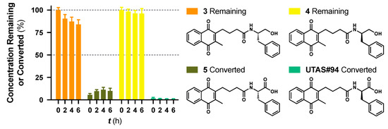 Metabolic stability of enantiomers 3 and 4 and their metabolic conversion to their oxidized forms 5. and UTAS#94, respectively. The concentration of 5 and UTAS#94 were calculated according to their analytical figures of merit, followed by normalization over the initial recovered concentrations of 3 and 4, respectively. Data was expressed as mean ± SEM from three independent experiments, with at least 3 data points each.