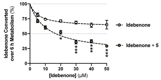 Reduced idebenone metabolism in the presence of the L-phenylalanine derivative 5. Data was expressed as mean ± SEM from three independent experiments, with 4 data points each. Non-linear fits and two-way ANOVA were performed for comparisons between with or without 5 supplemented: *** p < 0.001, * p < 0.033.