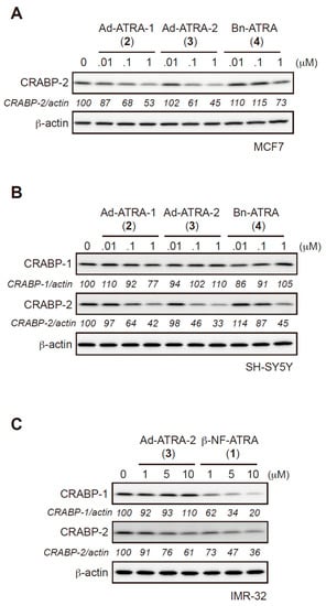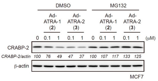 Since CRABP-2 was degraded by 1 and ITE-ATRA in SH-SY5Y cells that do not express AhR (Figures S1–S3), we assumed that the high hydrophobicity of the β-NF ligand module might play a role in the AhR-independent degradation of CRABP-2. Appending a hydrophobic moiety to a protein surface induces protein degradation; the hydrophobic moiety mimics a state of partial unfolding, inducing the degradation of the target protein via an intracellular quality control system [20,21,22]. Boc3-Arg- and adamantane-based hydrophobic tagging (HyT) strategies have been applied to a range of exogenous [23,24] and endogenous proteins [25,26]. To investigate whether CRABP proteins are degraded by the HyT system, we designed and synthesized 2 (Ad-ATRA-1) and 3 (Ad-ATRA-2) by conjugating an adamantane moiety (Figure 2). Besides, we designed 4 that lacked the benzochromene moiety of 1 because we expected that the hydrophobicity of 4 would be smaller than that of 1.