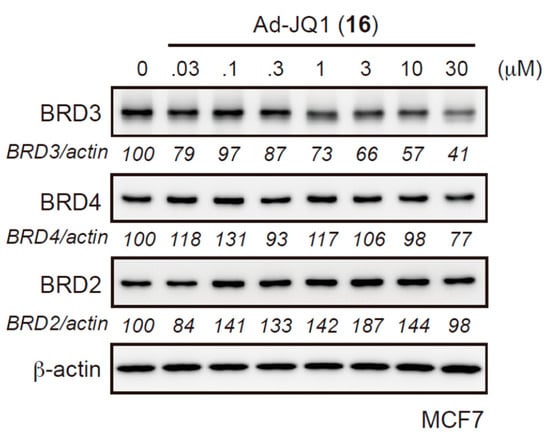 Next, we expanded the investigation to other target proteins. We previously developed the chimeric compound β-NF-JQ1 that is directed against bromodomain-containing (BRD) proteins using β-NF or (+)-JQ1 as an AhR or BRD ligand, respectively. β-NF-JQ1 induced the AhR-dependent degradation of BRD proteins in MCF-7 cells expressing AhR [16]. However, the β-NF-JQ1-induced reduction of BRD3, but not of BRD2 or BRD4, was also observed in SH-SY5Y cells, which do not express AhR (Figure S7), suggesting that BRD3 is also degraded by the AhR-independent mechanism. Therefore, we synthesized Ad-JQ1 (15) that conjugated an adamantane moiety to JQ1 (Scheme 4). Figure 5 presents the significant Ad-JQ1-induced reduction of BRD3, but not of BRD2 or BRD4 (Figure 5). These results suggested that BRD3, but not others, is susceptible to HyT-mediated degradation.