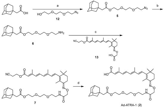 Scheme 1 presents the synthetic route of 2. 1-Adamantanecarboxylic acid was condensed with 12 [27] to obtain 5. Adamantane-ATRA, with an ester bond (Ad-ATRA-1, 2), was obtained after the reduction of the azide group in 5, the condensation with 13 [12], and the deprotection of 7. Adamantane-ATRA, with an amide bond (Ad-ATRA-2, 3) was also prepared via the condensation of 8 with 13, following a similar procedure (Scheme 2). Bn-ATRA (4) was obtained by condensing the corresponding glycol amino linkers with 13, followed by deprotection (Scheme 3).