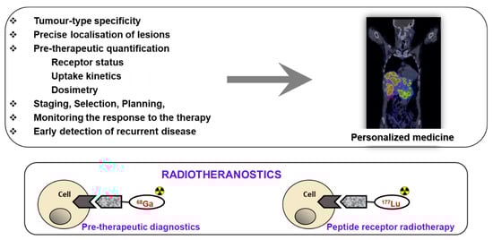 Receptor targeted chemo- and radiotherapeutics gain treatment precision and efficiency due to the prior quantification using molecular imaging for the stratification of the patients, adjustment of the therapeutic dose, and monitoring response (Figure 1). The treatment regimen depends on the stage of the disease at initial diagnosis and thus whole-body quantitative imaging reflecting heterogeneity of receptor expression and variability amongst patients is of utmost importance [2,3,4,5]. Further crucial advantage is possibility to monitor response to the therapy to introduce the treatment changes if necessary, as early as possible. Theranostics/radiotheranostics has strong potential not only for the optimized treatment but also for the exclusion of futile treatments that otherwise would cause unnecessary costs and patient distress. Apart from non-invasive imaging, radiation offers possibility of intraoperative detection for more accurate lesion resection.