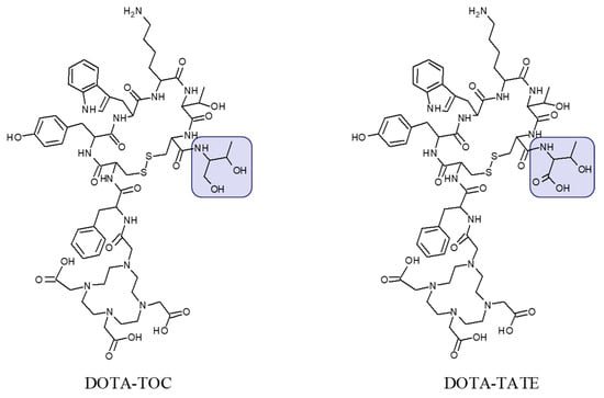 Chemical structure of DOTA-Tyr3-octreotide (DOTA-TOC) and DOTA-(Tyr3, Thr8)-octreotate (DOTA-TATE) presenting difference in C-terminal where the carboxyl group in threonine amino acid residue (DOTA-TATE) is exchanged to hydroxyl group (DOTA-TOC).