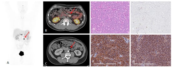 A 41-year-old man with metastatic lymph nodes on [68Ga]Ga-DOTA-TATE PET/CT. He had undergone previous surgery for pancreatic NET (patient 5). Mesenteric lymph node from primary pancreatic NET was found with probe with TBR of 3.4 for this 0.8 cm lesion (WHO grade 1). (A) [68Ga]Ga-DOTA-TATE PET maximum intensity projection image showing mesenteric/duodenal lesion in segment 3 (red arrow) and multiple retroperitoneal lymph nodes. (B) [68Ga]Ga-DOTA-TATE PET/CT image showing mesenteric mass with SUVmax of 72.8 (red arrow). (C) Arterial phase CT showing corresponding mesenteric mass (red arrow). (D) Representative hematoxylin and eosin staining of tumor showing NET in lymph node, WHO grade 1. (E) Representative immunohistochemistry for MIB-1 staining showing <2% of cells positive. (F) Immunohistochemistry for SSTR2 showing representative image for score 3 (membranous pattern of SSTR2 staining in >50% of tumor cells) (original magnification, ×20). (G) Immunohistochemistry for SSTR5 showing representative image of tumor with >10% of tumor cells positive (original magnification, ×20). Reproduced from [15].