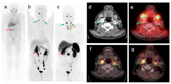 58-year old male patient with malignant extra-adrenal PGL. The intense focal [123I]MIBG uptake of the abdomen seen on anterior planar image ((a) red arrow) was confirmed by [68Ga]Ga-DOTA-TOC- and [18F]FDOPA PET/CT as being a soft tissue extra-adrenal PGL ((b,c) red arrows). After retrospective software-based image fusion of SPECT images with diagnostic CT images (d), symmetrical physiological [123I]MIBG uptake was observed in the parotid and submandibular glands (a,e). All verified head and neck lesions with focal [68Ga]Ga-DOTA-TOC ((c,f) green arrows) and [18F]FDOPA uptake ((b,g) green arrows) were [123I]MIBG negative (a,e). The small focus of [68Ga]Ga-DOTA-TOC uptake superior to the left upper lobe of the thyroid gland (c orange arrow) is a PGL lesion of the larynx (confirmed by diagnostic CT) which was negative in [18F]FDOPA PET (b). Compared to [123I]MIBG imaging (including SPECT/CT), [68Ga]Ga-DOTA-TOC PET/CT changed the tumor staging from non-malignant to metastatic disease. Reproduced from [43].