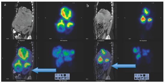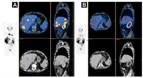 Non-linear correlation between SUV and Ki indicated that SUV most likely did not reflect SSTR density accurately at higher SUVs [100]. While high correlation found between Ki and TBR indicated that the latter might be more accurate metrics than SUV for semi-quantitative assessment of [68Ga]Ga-SST lesion uptake and treatment response monitoring [101]. Total functional tumor volume (TFTV) measured on [68Ga]Ga-SST PET and computed by summing the volumes of all pathological foci was suggested as prognostic biomarker with cut-off of 13.8 cm3 [102]. Somatostatin receptor expressing tumor volume (SRETV), defined as tumor volume with higher [68Ga]Ga-SST uptake than 50% of SUVmax within the volume of interest for each lesion, demonstrated prognostic value of survival [103]. Visual assessment of SSTR heterogeneity on [68Ga]Ga-SST PET/CT images was found valuable for prediction and prognosis with heterogeneity leading to lower survival, even though it is difficult to quantify (Figure 3) [104]. [68Ga]Ga-SST PET uptake heterogeneity determined based on intratumoral textural features predicted endoradiotherapy outcome more accurately than SUVmax [105]. A threshold of 2.5–4.46 or higher for probe TBR was found a sensitive parameter for guided surgical resection (Figure 4) [15,16].