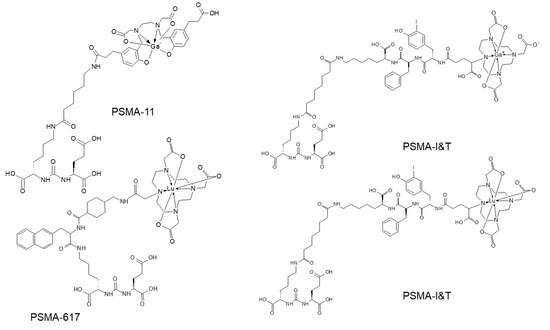 - Kopka, K.; Benesova, M.; Barinka, C.; Haberkorn, U.; Babich, J. Glu-Ureido-Based inhibitors of prostate-Specific membrane antigen: Lessons learned during the development of a novel class of low-Molecular-Weight theranostic radiotracers. J. Nucl. Med. 2017, 58, 17S–26S. [Google Scholar] [CrossRef]