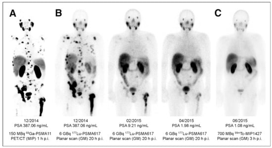 PSMA PET has demonstrated strong impact on therapy planning and clinical decision making with treatment regimen adjustment in 27%–77% of patients [136,137,138,139,140,141,142,143,144]. The most frequently used pair in the context of radiotheranostics is [68Ga]Ga-PSMA-11 and [177Lu]Lu-PSMA-617 (Figure 7). Despite the structural difference and various radionuclides, it was demonstrated that [68Ga]Ga-PSMA-11 PET plays an important role in predicting treatment response to [177Lu]Lu-PSMA-617 and monitoring response for patient treatment management optimization [131,145,146,147,148]. Phase II prospective clinical trial demonstrated correlation of the treatment response with the uptake of [68Ga]Ga-PSMA-11 (Figure 8) [146]. Encouraging results in terms of safety, efficiency, response rate, toxicity, and reduction of pain have been demonstrated by clinical trials assessing the role of [177Lu]Lu-PSMA-617 in patients with mCRPC (Figure 9) [131,132,149,150].