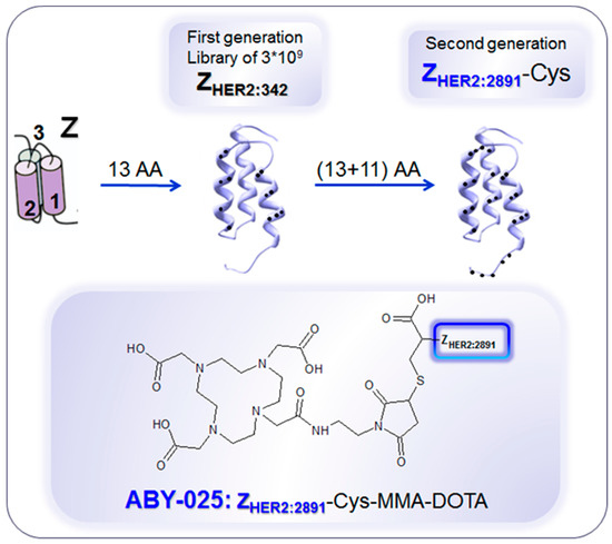 Development of anti-human epidermal growth factor receptor type 2 (HER2) Affibody® molecules. The variation of 13 amino acids (AA) on the binding surface of a 3-helix peptide structure (Z) resulted in a combinatorial library containing billions of variants from which the 1st generation HER2-binding Affibody molecule, ZHER2:342, was selected. Further modification of the non-binding surface resulted in the second generation Affibody molecule, ZHER2:2891, with higher thermal stability and hydrophilicity, diminished background interactions with immunoglobulins and production flexibility by peptide synthesis or recombinant expression as well as fully retained in vitro and in vivo functionality. ZHER2:2891 was modified by addition of a unique terminal cysteine for site-specific conjugation to the bifunctional chelator, 1,4,7,10-tetraaza cyclododecane-1,4,7-tris-acetic acid-10-maleimidoethylacetamide (MMA-DOTA). ZHER2:2891–Cys binds selectively to HER2 with high affinity (KD: 60 pM). Reproduced from [183].