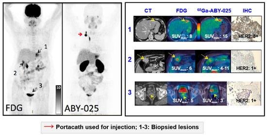 HER2-targeted treatment was changed as a consequence of [68Ga]Ga-ABY-025 PET examination in 19% (n = 16) of patients [5]. Figure 12 presents a case wherein the prior IHC analysis of the primary tumor biopsy specimen showed a borderline expression of HER2 and consequently the treatment with Trastuzumab was not considered. However, subsequent [68Ga]Ga-ABY-025/PET-CT detected bone metastasis and primary tumor with high SUVmax. The HER2-overexpression in the metastasis was confirmed by IHC. Consequently, the treatment regimen was significantly changed. Moreover, the false positive finding in the axilla by [18F]FDG/PET-CT (Figure 12D,F) was attributed to post-surgical inflammation. Given these examples it is difficult to overestimate importance of the targeting selectivity of [68Ga]Ga-ABY-025/PET-CT. Re-assessment of HER2 status is strongly encouraged due to high probability of the receptor conversion from positive to negative and vice versa [188]. Trastuzumab treatment was stopped after [68Ga]Ga-ABY-025/PET-CT examination that showed HER2 status conversion from positive to negative confirmed also by biopsy [5].