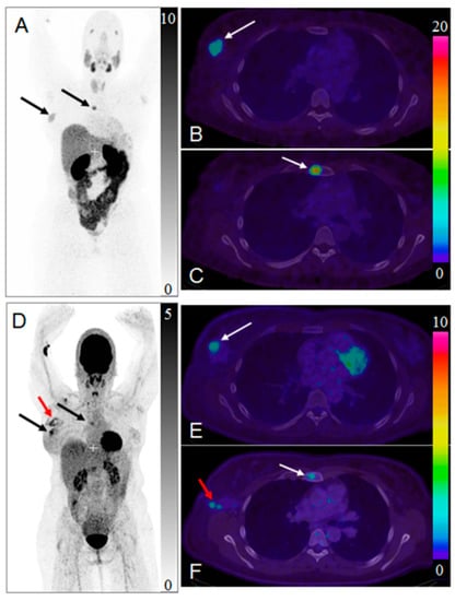 Maximum intensity projection positron emission tomography (PET) images of whole-body scan with [68Ga]Ga-ABY-025 ((A) 2 h) and [18F]FDG (D). Transaxial PET-CT fused images of the primary tumor ((B,E), respectively for [68Ga]Ga-ABY-025 (2 h) and [18F]FDG) and metastasis ((C,F), respectively for [68Ga]Ga-ABY-025 (2 h) and [18F]FDG). The black and white arrows indicate known tumor deposits. The red arrow (D,F) indicate post-surgical inflammation after biopsy wherein sentinel lymph node was tumor- and HER2-negative. Reproduced from [184].