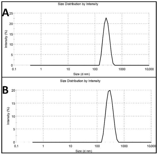 Intensity profile of (A) blank polybutylcyanoacrylate (PBCA) nanoparticles and (B) cisplatin-loaded PBCA nanoparticles.