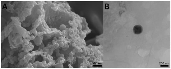 (A) scanning electron microscopy SEM and (B) transmission electron microscopy TEM images of cisplatin-loaded PBCA nanoparticles prepared using miniemulsion polymerization method (×15,000).