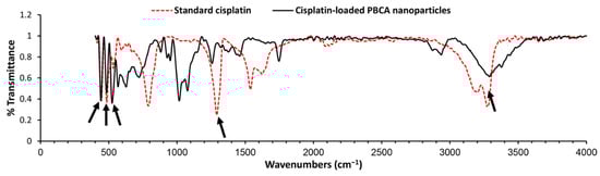 Fourier-transform infrared (FTIR) spectrum of the standard cisplatin and cisplatin-loaded PBCA nanoparticles. Arrows show the position of chemical bonds of cisplatin [26].