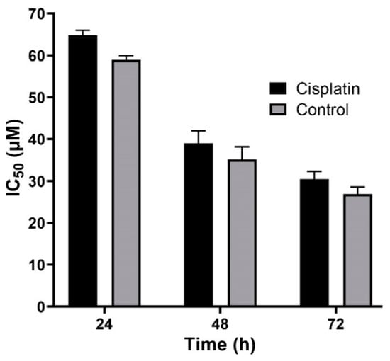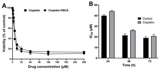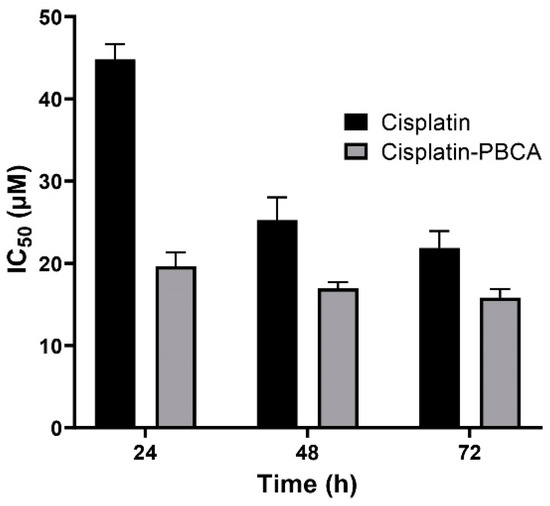 Cytotoxicity effects (IC50) of the control (the combination of the free drug with blank PBCA nanoparticles) and cisplatin against BHK-21 cells (39.9 ± 1.0, 21.4 ± 1.5, and 19.0 ± 1.1 µM after 24-, 48-, and 72-h incubation, respectively). The data were expressed as mean ± SD (n = 3).