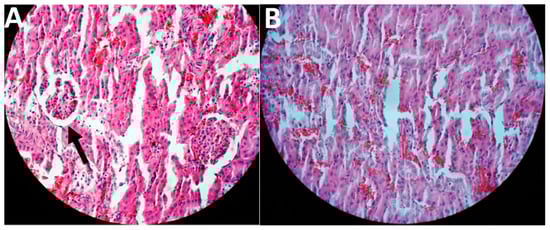 Histological evaluation of kidney tissue in kidney cancer-bearing rats received (A) the standard cisplatin and (B) cisplatin-loaded PBCA nanoformulation. The arrow shows ATN.