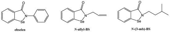Molecular structure of ebselen, N-allyl-1,2-benzisoselenazol-3(2H)-one (N-allyl-BS), and N-(3-methylbutyl)-1,2-benzisoselenazol-3(2H)-one (N-(3-mb)-BS).