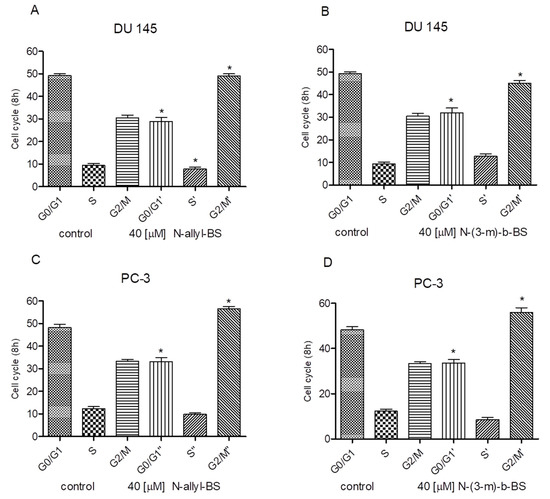 Next, the inhibitory effect of N-allyl-BS on the cell cycle was determined while using flow cytometry. The experiment revealed that the 8h incubation of tumor cells with 40 μM N-allyl-BS and N-(3-mb)-BS significantly increased the percentage of cells in the G2/M phase. This phenomenon was observed in both cancer cell lines tested (Figure 3A–D). Therefore, N-allyl-BS and N-(3-mb)-BS induced G2/M cell cycle arrest. Moreover, the cytostatic effect on PC-3 cells was stronger than that exerted on DU145 cells (Figure 3C,D).