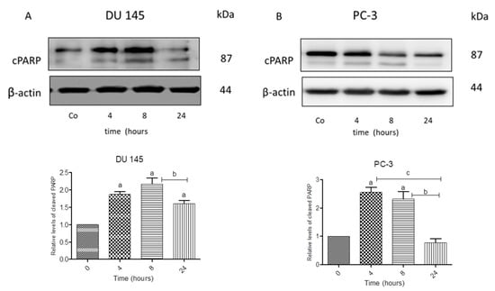 Western blot analysis of cleaved PARP in DU 145 (A) and PC-3 cells (B) treated with 40 µM N-allyl-BS for indicated time points. β-actin was used as a lane loading control. The results are presented as mean ± SE of three independent experiments. The statistical significance of differences between respective samples was determined by one-way ANOVA followed by Bonferroni’s multiple comparison test, where (A) indicates significant difference between control and treated cells P < 0.05 and (b, c) indicates significant difference between 4, 8, and 24 h of 40 µM N-allyl-BS-treated cells P < 0.05.