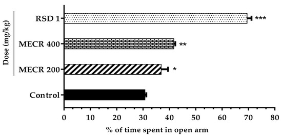 To verify the anxiolytic activity of MECR, we utilized elevated plus maze (EPM) and hole board (HB) animal models [43,44]. Both tests are regarded as popular paradigms due to the quick valuation of the possible anxiety modulating responses in mice. The typical EPM tool has two opposite open and two bounded arms, whereas the open arena is supposed to be more fearful for the animals, and an anxiolytic agent stimulates the mice to open arm exploration [45]. Similarly, the hole board test (HBT) has been designed to measure the exploratory responses and multiple dimensions of the unconditioned behavior of a mouse to an unfamiliar environment [46]. The manifestation of more hole poking (head dipping) tendency indicates a high level of anxiolytic activity, while the hesitancy expression of visiting the hole results from a high level of anxiety. However, during the experiment, mice treated with MECR (200 and 400 mg/kg) demonstrated a reduction in anxiety-like behavior by reflecting increased entries to, and time spent in the open alleys as well as elevated the exploratory behavior followed by demonstrating the higher number of head dipping. The neurobiological mechanism of anxiety is the result of either an imbalance of neurotransmitter (dopamine, GABA, and serotonin) function or dysregulation of glutamatergic, serotonergic, GABA-ergic, and noradrenergic transmission [47]. In our experiment, MECR may exert anxiolytic actions by modifying neurotransmitter synthesis and functions. It is supposed that active components of MECR interact with the neurotransmitter or neuromodulator receptors, which regulate the neuronal communication, stimulate the CNS activity, and improve the function of endocrine systems [48].