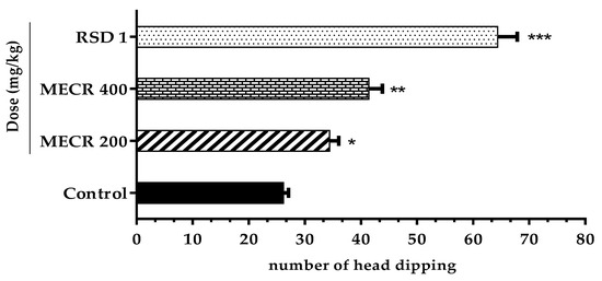 In this test, mice treated with MECR (200 and 400 mg/kg) exhibited notable exploratory behavior in a dose-dependent fashion (Figure 2). Particularly, the treatment of 400 mg/kg revealed a significant (p < 0.001) hole poking tendency followed by a higher number of head dipping (41.40 ± 2.42) compared to 200 mg/kg (34.40 ± 1.63); (p < 0.05). In addition, the positive control diazepam (1 mg/kg, i.p.) revealed (p < 0.001) higher number of head dipping (64.33 ± 2.32) in comparison to the control group (26.33 ± 1.44).