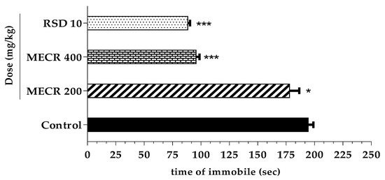 The tail suspension test is simple and most reliable method to screen the antidepressant activity of MECR [25]. After the administration of all doses, as described in Section 2.5, mice were induced into a state of depression (immobility), hanging by the end of tail using adhesive tape (nearly 1 cm from the tip of the tail). The total time of immobility was recorded during the last four minute of a total six minute for each mouse of all groups.