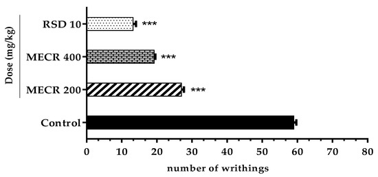 This test has been conducted to evaluate the anti-nociceptive activity of MECR in mice, followed by the method of Adnan et al. [26]. The randomly divided experimental mice (n = 6) of each group were treated as described in Section 2.5 above. After 30 min of treatment, acetic acid 0.6% (v/v) was intraperitoneally injected in mice to induce writhing (abdominal pain). Five min after administration of acetic acid, the writhing number for each mouse was counted for 20 min. The percentage of inhibition was measured by using following equation: