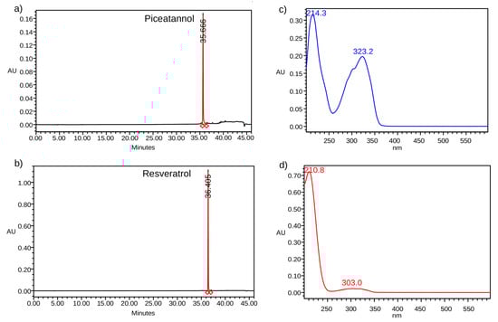 High-performance liquid chromatography with diode array detection (HPLC-DAD) chromatograms of the standard solutions: (a) piceatannol; (b) resveratrol. UV spectra of the standard solutions: (c) piceatannol; and, (d) resveratrol.
