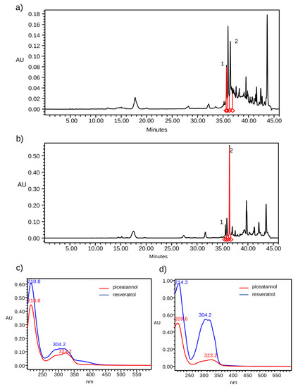HPLC-DAD chromatograms (320 nm) of the extract obtained by the ultrasound method with ethanol (a) and with acetone (b). Number 1 and 2 corresponds to piceatannol and resveratrol, respectively. The UV spectra of piceatannol (red) and resveratrol (blue) detected on ethanol (c) and acetone (d) extracts.