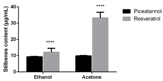 There are no significant differences regarding the amounts of piceatannol in the samples obtained with ethanol and acetone, according to Figure 3. However, there is a higher amount of resveratrol in samples extracted with acetone. When comparing the amount of piceatannol and resveratrol found in the extracts, it was verified that the extracts obtained using ethanol showed small differences of stilbenes content, whereas in the case of extracts that were obtained with acetone, the amount of resveratrol was significantly higher than the amount of piceatannol. These results corroborate other previous studies, in which the amount of resveratrol was higher than the amount of piceatannol found in plants [28,29,30]. Some authors showed that the amount of resveratrol in grapes was approximately four times higher than that of piceatannol (0.78 μg/g and 3.18 μg/g, respectively) [31].