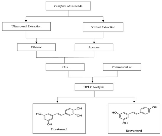 The flow diagram for the extraction of the two stilbenes, piceatannol and resveratrol, can be seen in Figure 5. Briefly, after preparing the extracts, these were compared with a commercial oil from Akoma (London, UK), regarding the content of the stilbenes studied through HPLC analysis. In addition to determining the presence of stilbenes, the content of these elements in the extracts were also quantified.