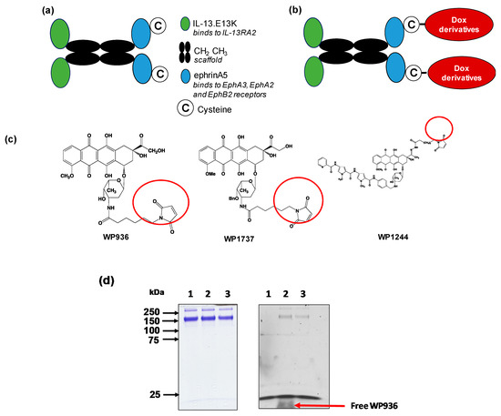 Dox derivatives conjugation to QUAD 3.0. (a) A schematic of the QUAD 3.0 protein showing the CH2 CH3 domains of the human IgG1 used as a scaffold. IL-13.E13K, a modified version of the IL-13 ligand, is present in the N-terminal of the molecule and ephrinA5 along with a cysteine present in the C-terminal end of the molecule; (b) A schematic of the conjugation of Dox derivatives to the QUAD 3.0 molecule; (c) The structure of the three Dox derivatives used in the study that are thiol reactive (circled) and form a stable thioether bond with the thiol present in the cysteine residue; (d) SDS-PAGE (left panel) and corresponding fluorescent image the same gel (right panel) of QUAD 3.0 (lane 1) and its QUAD 3.0-WP936 conjugate before (lane 2) and after the removal of excess unconjugated WP936 using a Zeba desalting column (lane 3). To detect the fluorescently labeled protein, the gel was scanned using an Amersham AI 600RGB digital scanner.